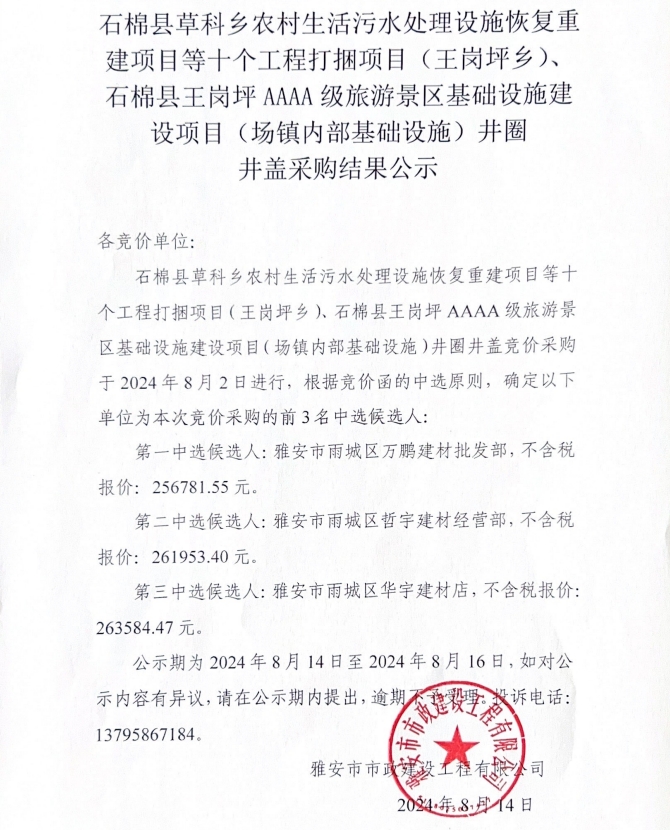 石棉縣草科鄉(xiāng)農村生活污水處理設施恢復重建項目等十個工程打捆項目(王崗坪鄉(xiāng))、石棉縣王崗坪AAAA級旅游景區(qū)基礎設施建設項目(場鎮(zhèn)內部基礎設施)井圈井蓋采購結果公示
