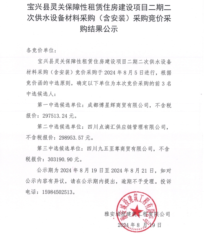 寶興縣靈關(guān)保障性租賃住房建設(shè)項目二期二次供水設(shè)備采購(含安裝)采購競價采購結(jié)果公示