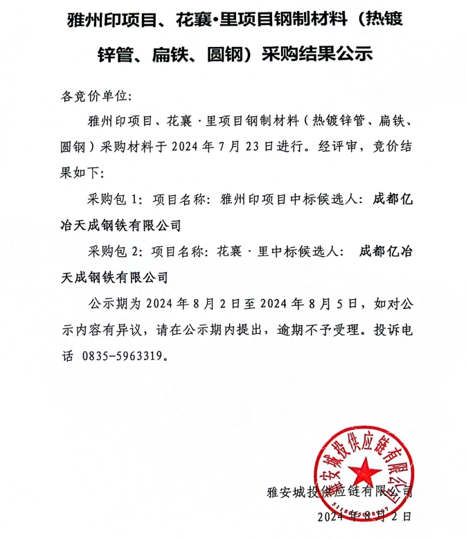 雅州印項(xiàng)目、花襄·里項(xiàng)目鋼制材料(熱鍍鋅管、扁鐵、園鋼)采購(gòu)結(jié)果公示