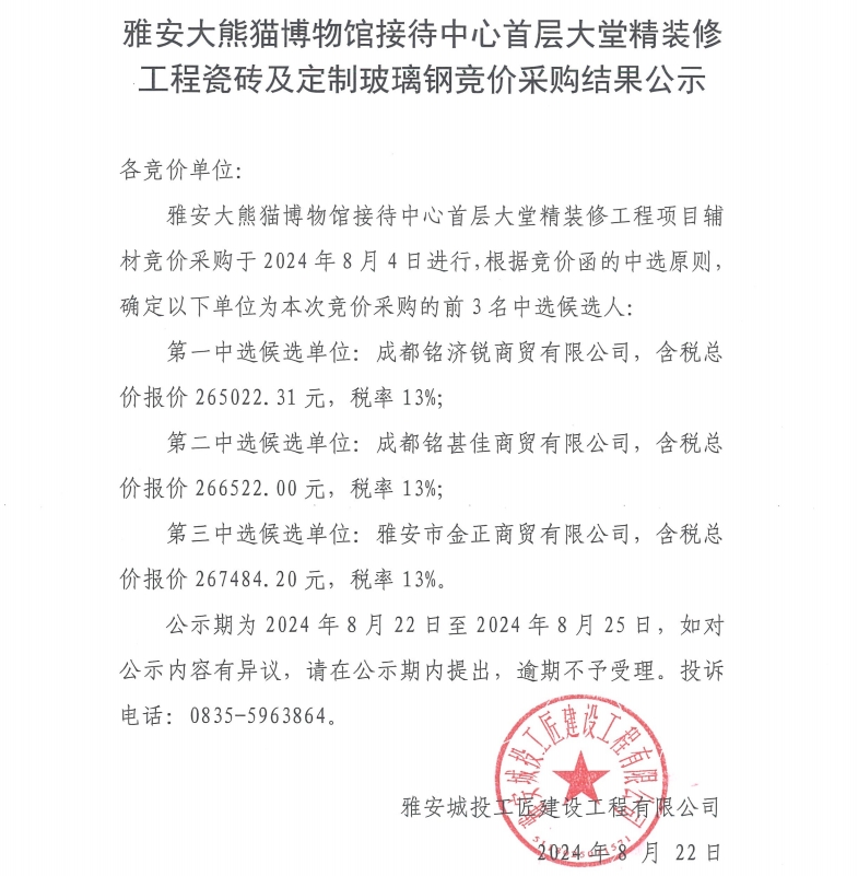 雅安大熊貓博物館接待中心首層大堂精裝修工程瓷磚及定制玻璃鋼競(jìng)價(jià)采購結(jié)果公示