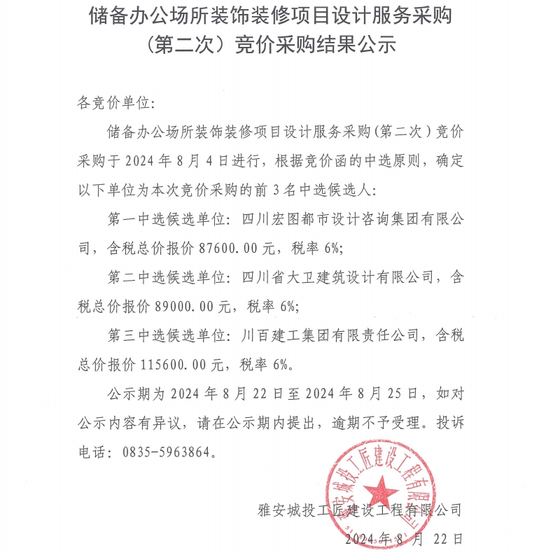儲備辦公場所裝飾裝修項目設(shè)計服務(wù)采購(第二次)競價采購結(jié)果公示