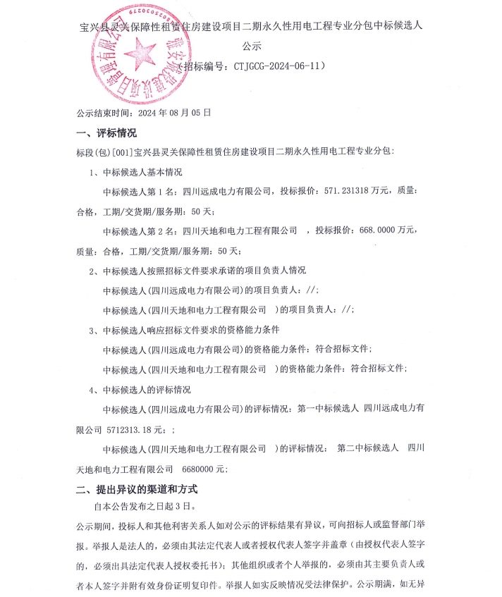 寶興縣靈關(guān)保障性租賃住房建設(shè)項目二期永久性用電工程專業(yè)分包中標候選人公示