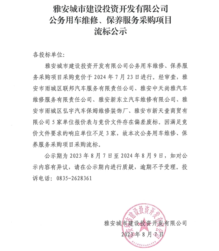 雅安城市建設(shè)投資開發(fā)有限公司公務(wù)用車維修、保養(yǎng)服務(wù)采購項目流標公示