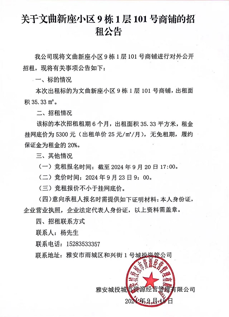 關(guān)于文曲新座小區(qū)9棟1層101號商鋪的招租公告