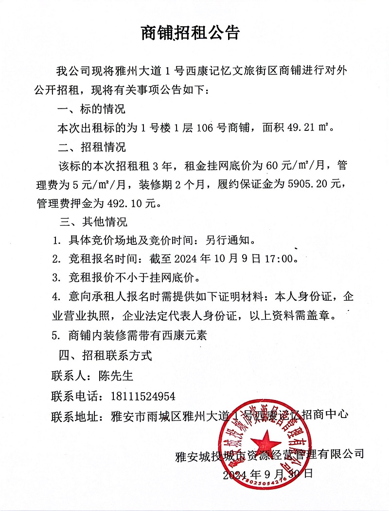 雅州大道1號西康記憶文旅街區(qū)商鋪招租公告