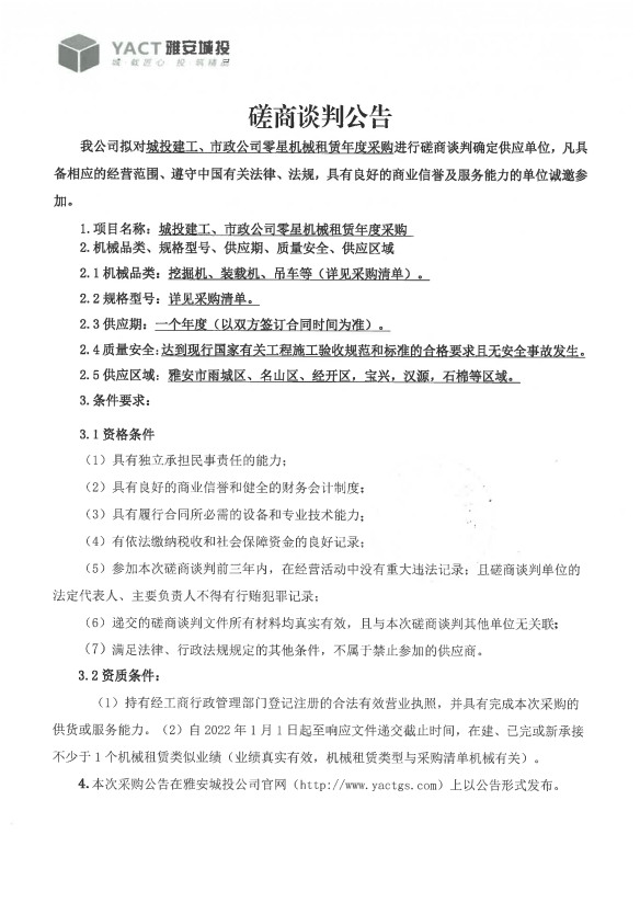 城投建工、市政公司零星機(jī)械租賃年度采購磋商談判公告