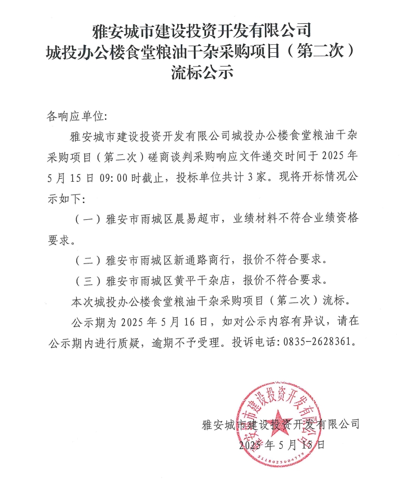 雅安城市建設(shè)投資開發(fā)有限公司城投辦公樓食堂糧油干雜采購項目(第二次)流標公示