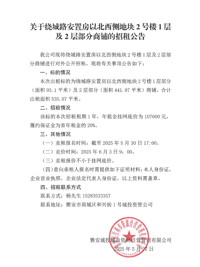 關(guān)于繞城路安置房以北西側(cè)地塊2號(hào)樓1層及2層部分商鋪的招租公告