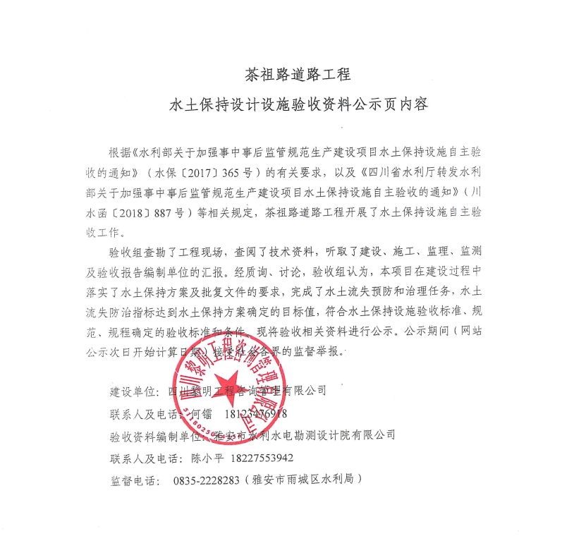 茶祖路道路工程水土保持設(shè)計設(shè)施驗收資料公示頁內(nèi)容