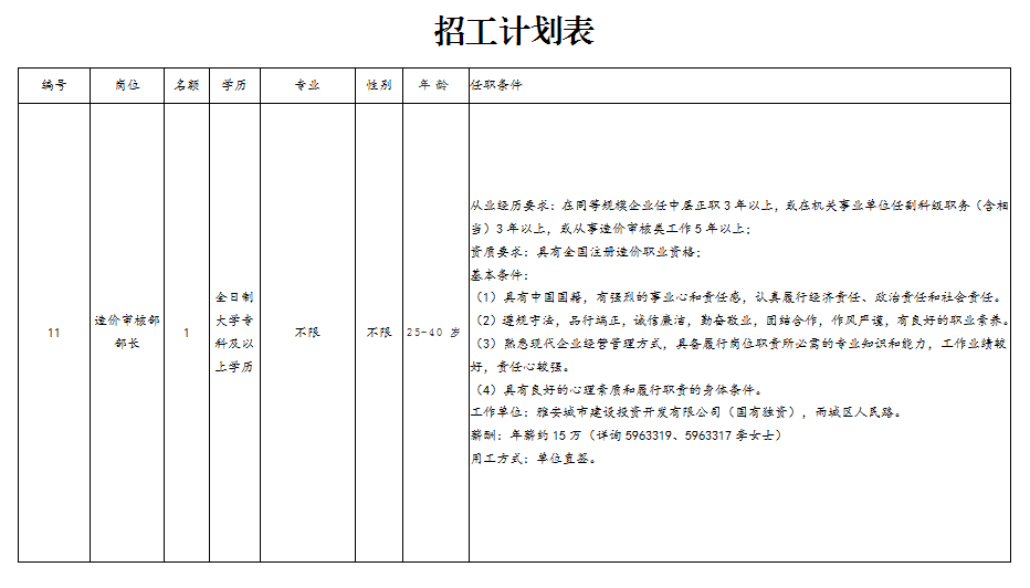 雅安城市建設(shè)投資開發(fā)有限公司造價審核部部長1名。