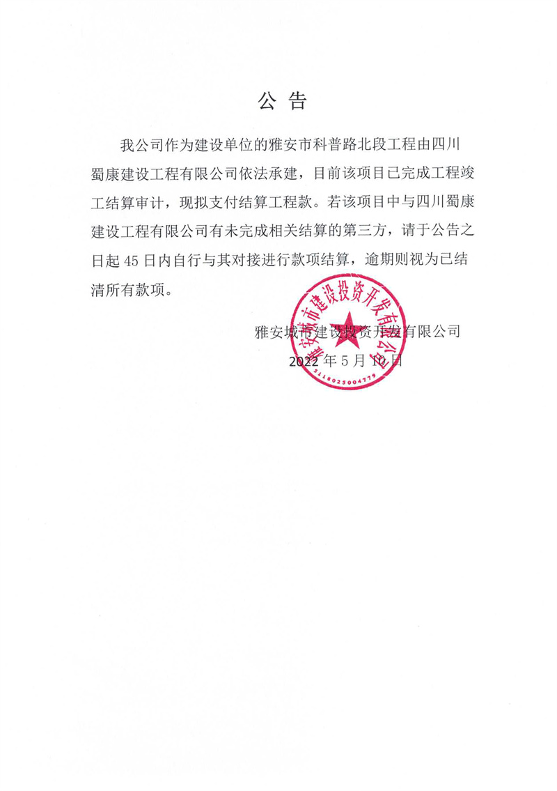 關(guān)于雅安市科普路北段工程的公告